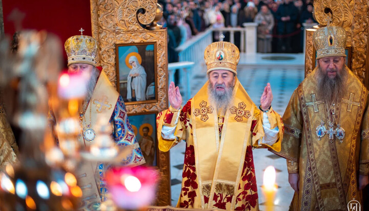 Предстоятелю УПЦ співслужили намісник обителі митрополит Вишгородський і Чорнобильський Павел, керуючий справами УПЦ митрополит Бориспільський і Броварський Антоній, єпископ Ірпінський Лавр, єпископ Бородянський Марк, духовенство обителі та гості у священному сані.