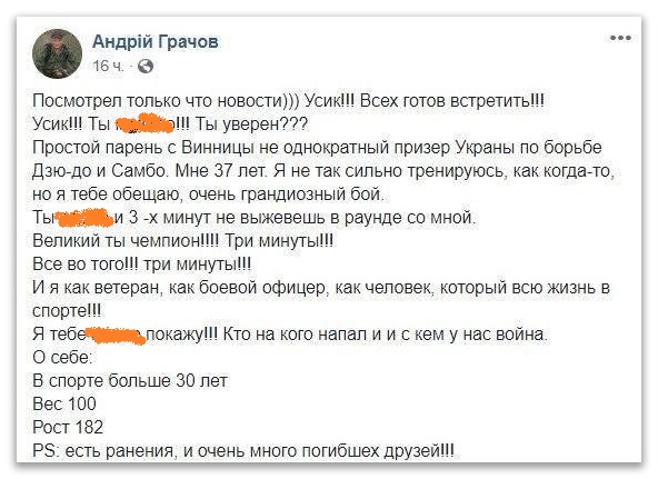 12 травня 2020 року начальник управління у справах ветеранів війни Вінницької ОДА Андрій Грачов, який раніше погрожував УПЦ, опублікував на своїй сторінці в Facebook виклик на бій для Олександра Усика, однак пізніше видалив власний пост. Про це повідомило інтернет-видання «Оглядач».
