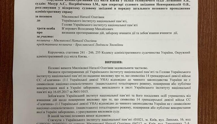 «Визнати незаконними дії Інституту Національної пам'яті та директора Інституту національної пам'яті з надання висновку про те, що символіка 14-ї гренадерської дивізії військ СС «Галичина» (Першої української дивізії УНА), відповідно до законодавства України не є символікою націонал-соціалістичного (нацистського) тоталітарного режиму, поширення і використання якої в Україні заборонено», – йдеться в судовому рішенні.