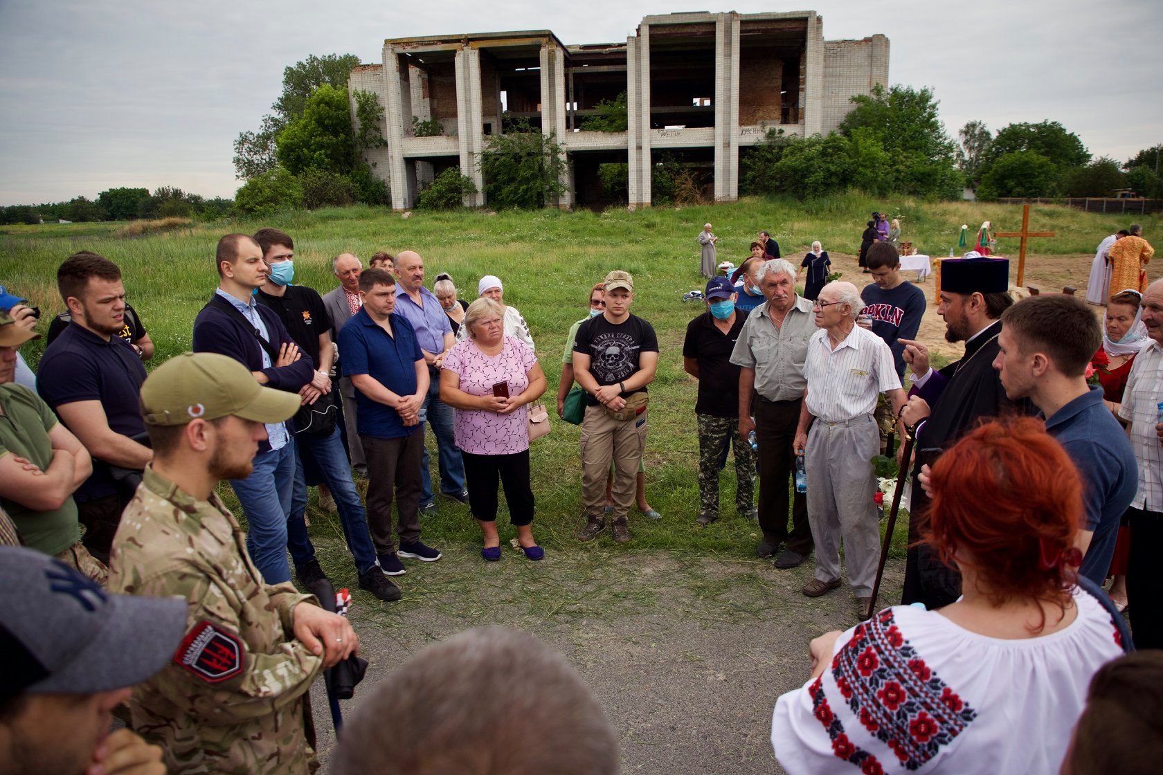 Напередодні ділянку розрівняли трактором, а в сам день «освячення» екс-митрополит Олександр Драбинко привіз із собою представників «Правого сектора» і С-14, які відтіснили людей, які намагалися поговорити з організаторами заходу.