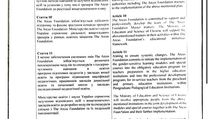 14 квітня 2023 року Міністерство освіти і науки та американський неурядовий фонд The Arcus Foundation підписали меморандум «про упровадження гендерно чутливих методів навчання в освітній процес закладів дошкільної, шкільної та вищої освіти». Про це повідомляє телеграм-канал MediaKiller, публікуючи фотографії документа.