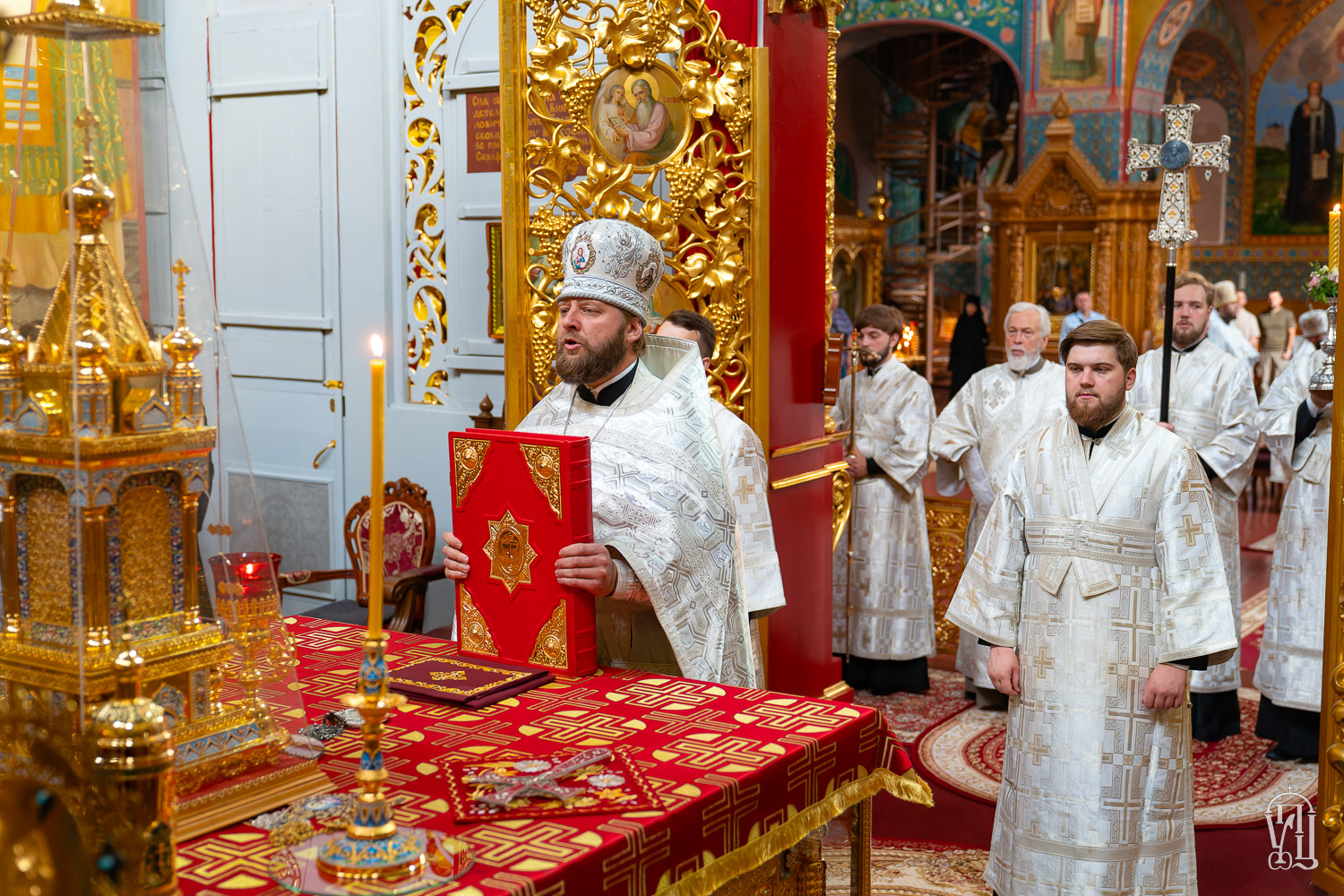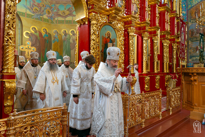 Богослужіння відбулося в головному храмі монастиря – Пантелеймонівському соборі. Предстоятелю співслужили керуючий справами УПЦ митрополит Бориспільський і Броварський Антоній, митрополит Ніжинський і Прилуцький Климент, архієпископ Хмельницький і Старокостянтинівський Віктор, єпископ Переяслав-Хмельницький Діонісій, єпископ Ірпінський Лавр, єпископ Бородянський Марк і духовенство обителі.