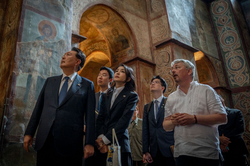 Президент України Володимир Зеленський разом із першою леді Оленою Зеленською та Президент Республіки Корея Юн Сок Йоль разом із дружиною Кім Кон Хі відвідали Софійський собор у Києві, повідомляє president.gov.ua.