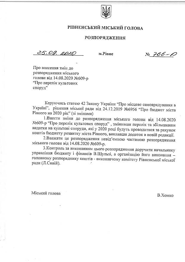 Міський голова Рівного Володимир Хомко видав розпорядження, згідно з яким УГКЦ та ПЦУ отримають 500 тисяч гривень з міського бюджету. Документ опублікований на сайті міськради Рівного.