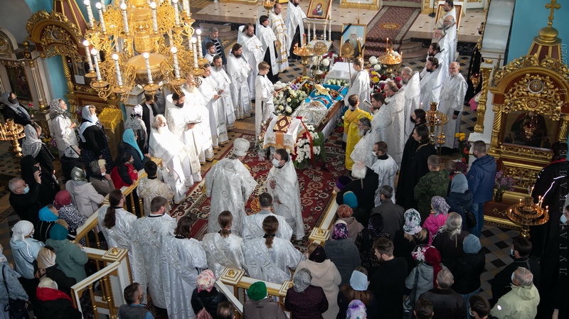 Під час богослужіння священнослужителі та миряни попрощалися з новопреставленим митрополитом Іоанникієм і помолилися за упокій його душі.