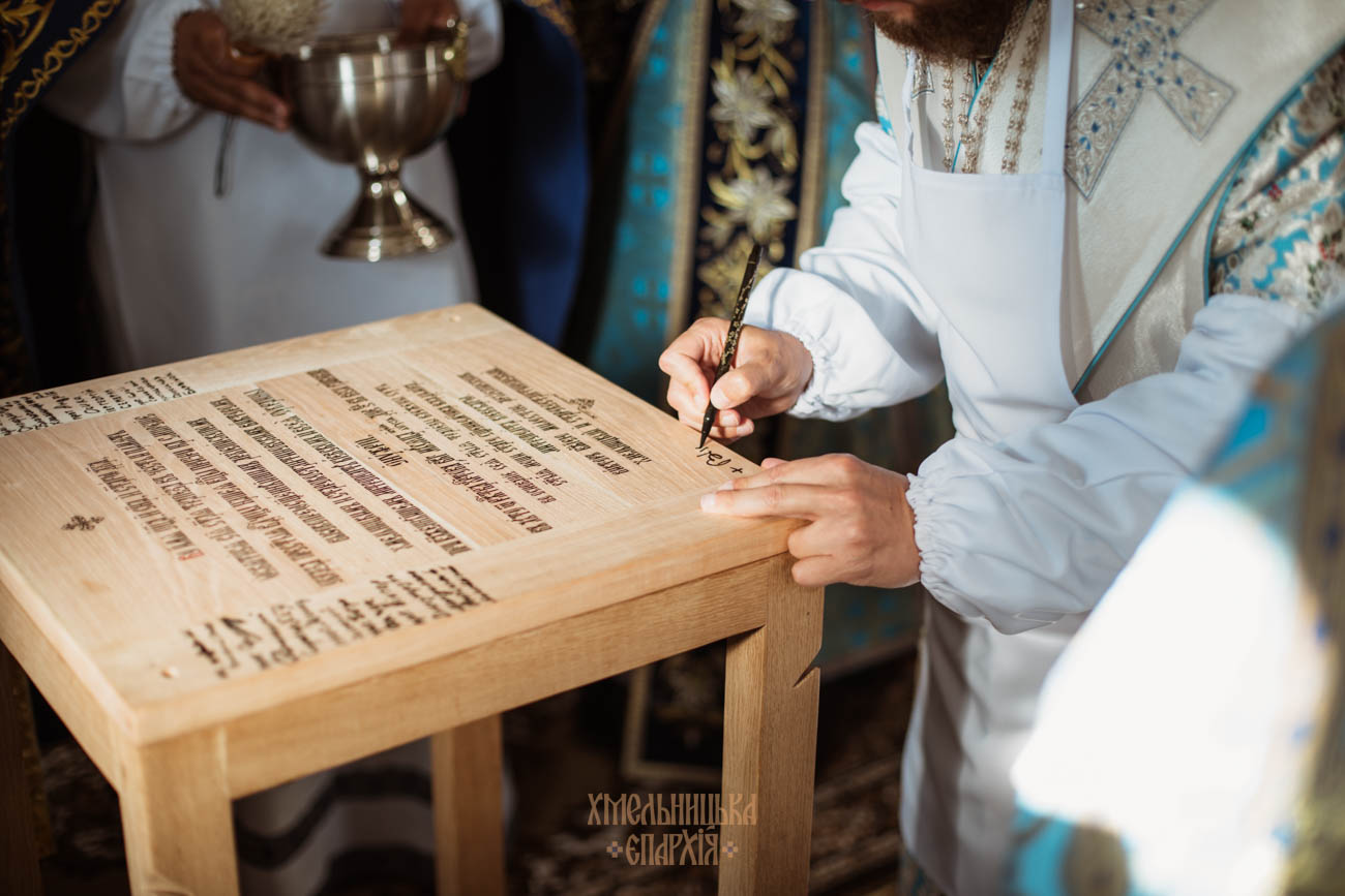 Чин освячення, а потім Божественну літургію очолив архієпископ Хмельницький і Старокостянтинівський Віктор. Йому співслужили секретар єпархіального управління протоієрей Олександр Рибчинський, благочинний Хмельницького районного округу протоієрей Віктор Онофрейчук, настоятель храму протоієрей Георгій Сосновський, духовенство благочиння та гості у священному сані.