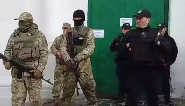 На відео, яке опублікував Telegram-канал, вхід до собору блокують поліцейські й автоматники у військовій формі та балаклавах.