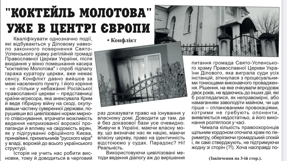Релігійна громада свято-Успенського храму УПЦ села Ділове Рахівського району Закарпатської області звернулася до редактора місцевої газети «Зоря Рахівщини» з відкритим листом, в якому закликала не дезінформувати громадськість про події, що відбуваються в селі. Текст листа опублікувала прес-служба Хустської єпархії УПЦ.