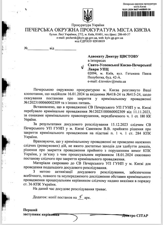 18 січня 2024 року Печерська окружна прокуратура Києва скасувала постанову слідчого Нацполіції про закриття кримінальної справи проти активістів, які перешкоджають здійсненню релігійного обряду біля Києво-Печерської лаври. Відповідні постанови прокуратури опублікував адвокат Лаври протоієрей Микита Чекман у своєму Telegram-каналі.