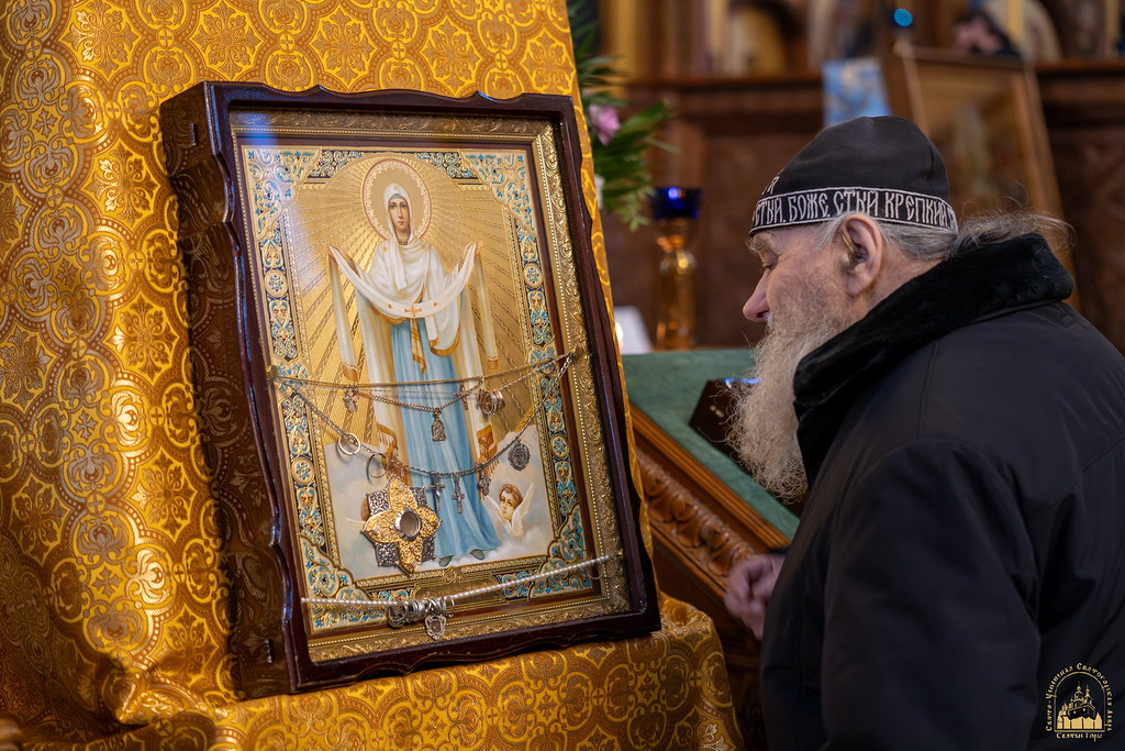 Святині зустріли біля входу в Успенський собор намісник Лаври митрополит Святогірський Арсеній із духовенством монастиря. Ікони та ковчег встановили на середині храму і звершили перед ними молебний спів про мир в Україні з читанням акафіста Покрову Божої Матері. Молебень очолив митрополит Арсеній у співслужінні братії обителі у священному сані та священнослужителів, які звершують хресну ходу.