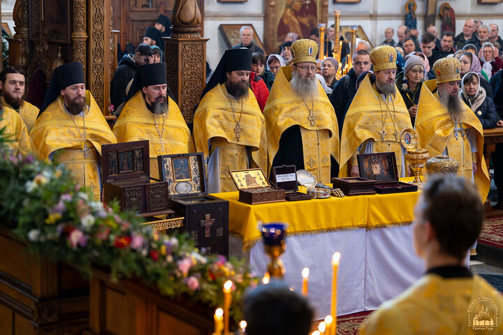 Наприкінці братія обителі та прочани приклалися до всіх святих мощей та ікон з частинками найбільших християнських реліквій, встановлених посередині Успенського собору напередодні.