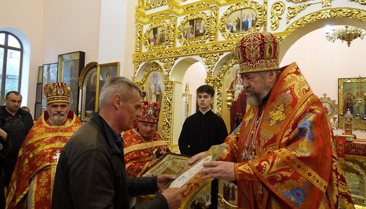 Після богослужіння за заслуги перед Українською Православною Церквою були відзначені церковними нагородами: Роману Панченку вручили орден святителя Миколая Чудотворця, Віктору Лотоусу – орден святителя Димитрія, митрополита Ростовського, благочинному Полтавського районного округу протоієрею Олександру Антонюку – орден святого благовірного князя Ярослава Мудрого. Благодійники Свято-Покровського храму в місті Кобеляки були нагороджені архієрейськими грамотами.