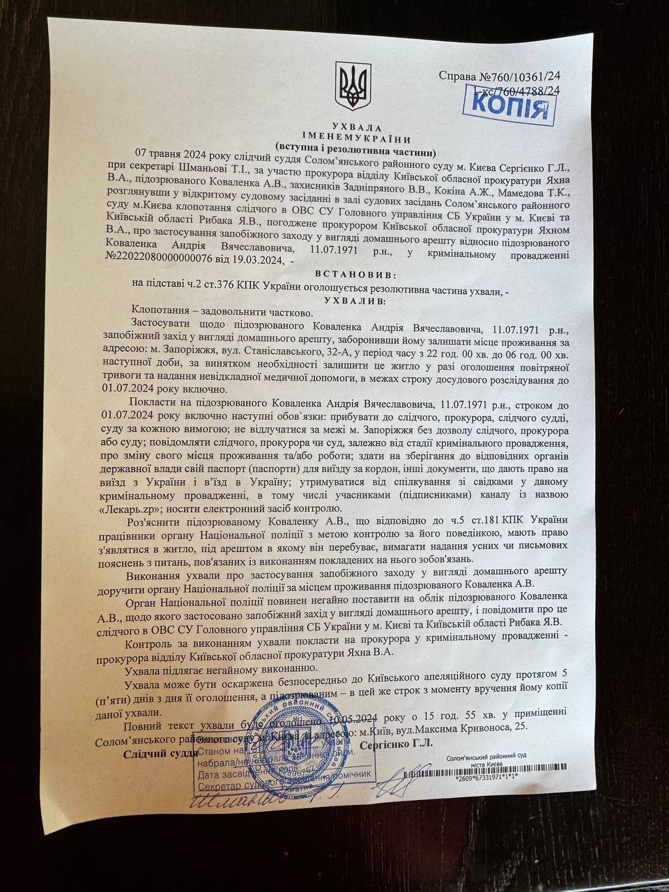 7 травня 2024 року митрополиту Запорізькому і Мелітопольському Луці в Києві суддя Солом'янського районного суду обрав запобіжний захід у вигляді нічного домашнього арешту на два місяці та носіння електронного засобу контролю. Висновок судді опублікував у себе в телеграм-каналі владика.