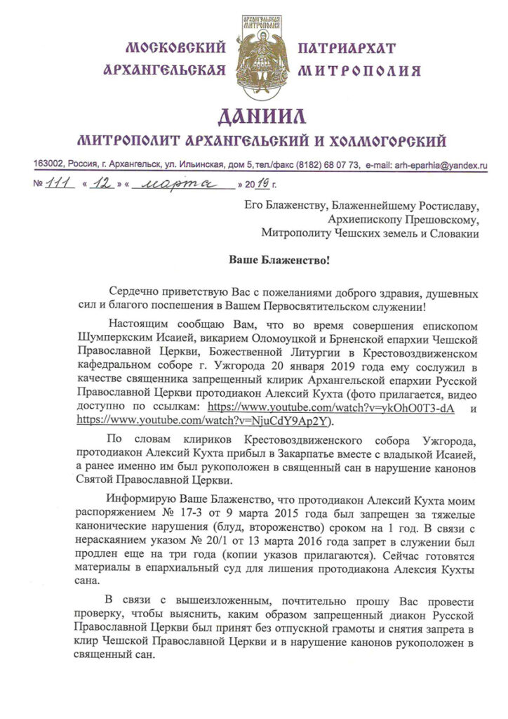 Ресурс опублікував інформацію, що єпископ Ісайя в січні 2019 р. привіз до Ужгорода Олексія Кухту, якого раніше висвятив на священика, і там співслужив з ним в ужгородському соборі. 12 березня 2019 р. митрополит Архангельський і Холмогорський Даниїл у листі до Предстоятеля Православної Церкви Чеських земель і Словаччини Блаженнішого Митрополита Ростислава повідомив йому про цей факт.