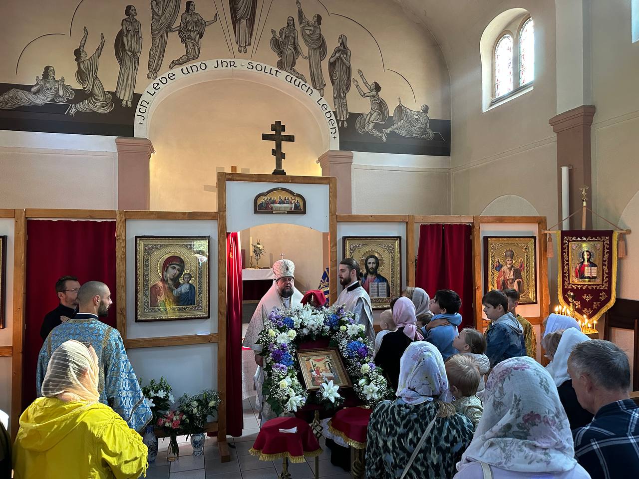 За богослужінням в українській парафії на честь Живоначальної Трійці в Лейпцигу владиці співслужили благочинний Південного благочиння парафій УПЦ у Німеччині та настоятель храму протоієрей Максим Бойчура, а також настоятели інших парафій УПЦ у Німеччині, які духовно опікуються православними українцями.