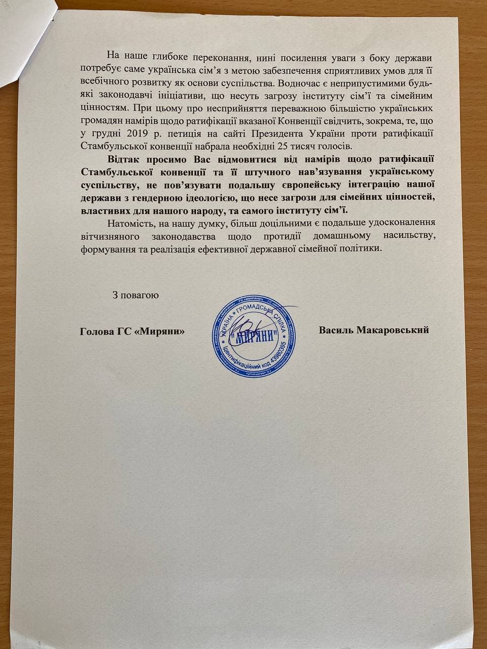 «Під приводом боротьби з домашнім насильством ця конвенція просуває в наше життя "гендерну ідеологію", пропагуючи ЛГБТ-спільноти у всіх сферах життя. Ми ж пропонуємо Президенту України Зеленському В. А. зміцнювати українську родину, як основу нашого суспільства», – зазначили в громадській організації.