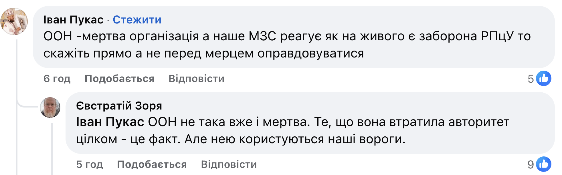 Спікер ПЦУ Євстратій Зоря у своєму Facebook розповів, ніби ООН «втратила авторитет» і тепер «нею користуються наші вороги». Про це Зоря заявив у контексті доповіді Управління Верховного комісара ООН з прав людини, в якій було розкритиковано закон щодо заборони УПЦ. Зоря перепостив інформацію про «миттєву реакцію українського МЗС на висновки Верховного комісара ООН», і що «закон не передбачає заборони жодної з церков, що існують в Україні».
