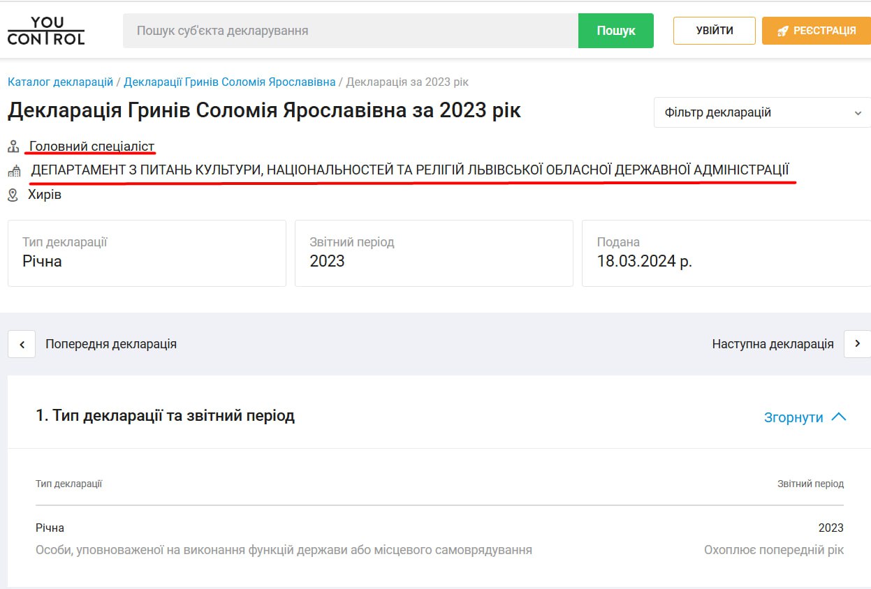 У податковій декларації її зазначено як головного спеціаліста Департаменту культури національностей та релігій Львівської ОДА.