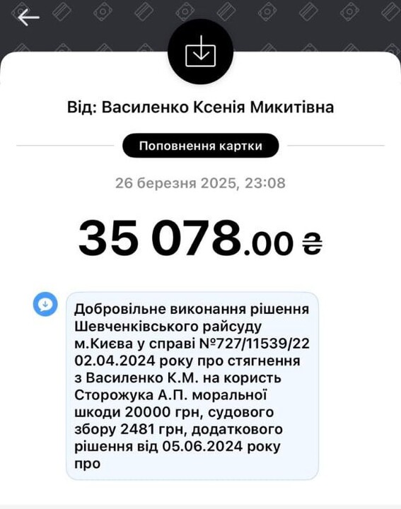 Кошкіна перерахувала владиці 35 тисяч гривень, а видавництво заплатило за судові витрати майже 10 тисяч гривень.
