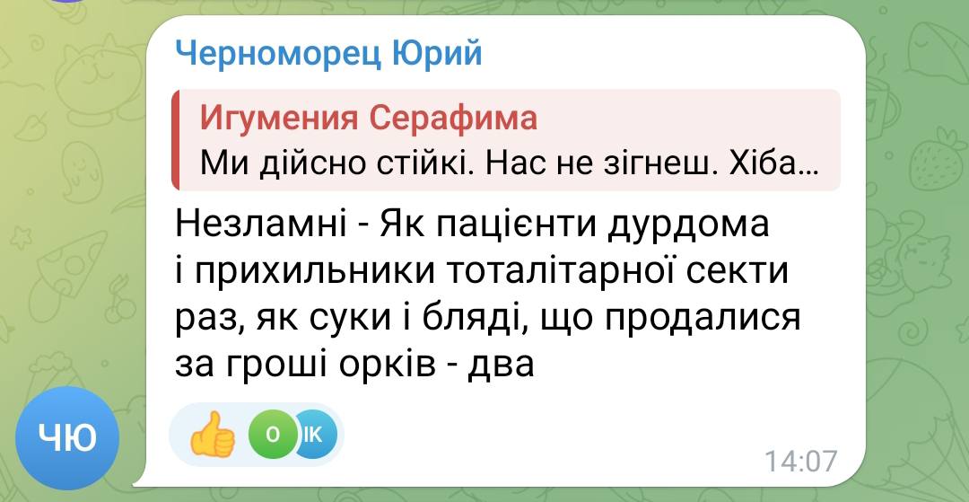 «Пацієнти дурдому і прихильники тоталітарної секти – раз. С*ки і бл*ді, які продалися за гроші орків – два. Я – не держава. Я б з вами не церемонився, с*ки», – написав серед іншої лайки Чорноморець у відповідь на коментар ігумені Серафими (Шевчик) про те, що УПЦ стійко тримається під час гонінь влади на Церкву.