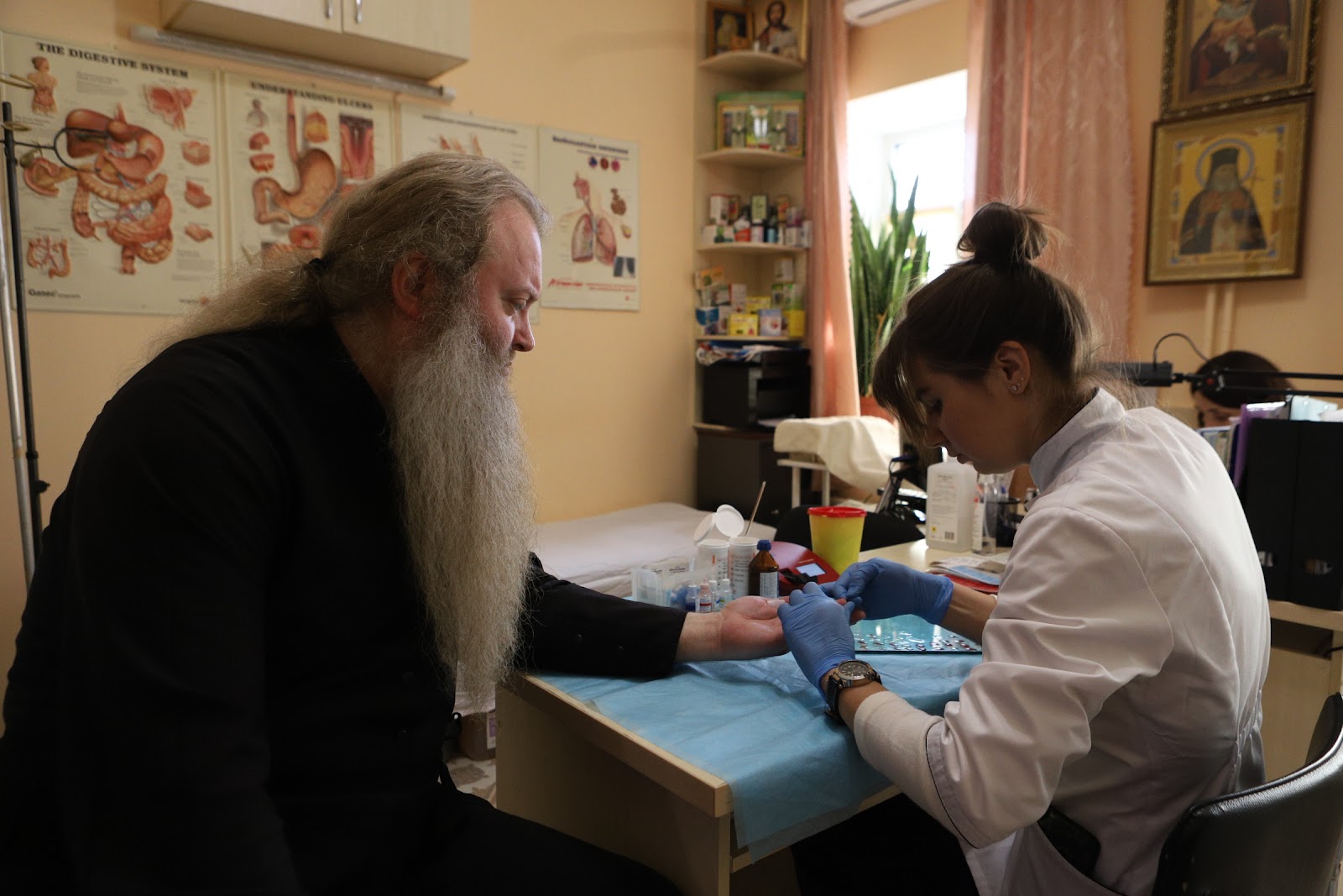 Для забору крові до медичної частини Київських духовних шкіл приїхали співробітники Відділення переливання крові Національного інституту серцево-судинної хірургії ім. М.М. Амосова. Фахівці формують банк крові, необхідний для порятунку поранених, постраждалих від військових дій, жертв нещасних випадків та пацієнтів із тяжкими захворюваннями.