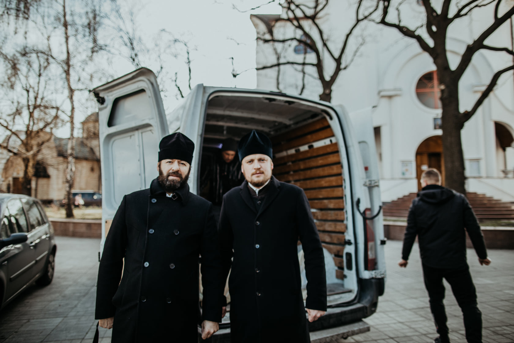 Ключар собору протоієрей Віталій Коцаба передав гумдопомогу настоятелю храму на честь архістратига Божого Михаїла Бучанського благочиння протоієрею Петру Чопику, який організує доставку вантажу до Михайлівки-Рубежівки.