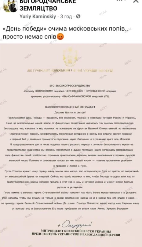 В Івано-Франківській єпархії Української Православної Церкви повідомили про розповсюджуваний у соціальних мережах фейковий лист нібито Предстоятеля УПЦ Блаженнішого Митрополита Київського і всієї України Онуфрія до тимчасово керуючого єпархією єпископа Хотинського Веніаміна (Межинського).