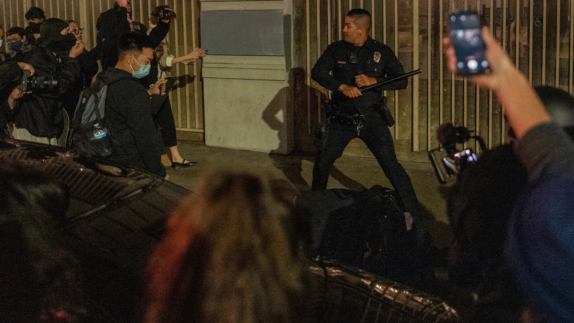 Поліція Лос-Анджелеса повідомила, що з натовпу почали кидати каміння та пляшки в поліцейських, одного офіцера поранено.