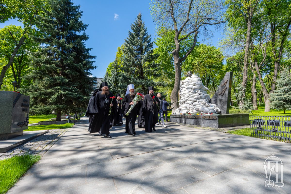 До пам'ятника загиблих воїнів прийшли керуючий справами УПЦ митрополит Бориспільський і Броварський Антоній, єпископ Білогородський Сильвестр, єпископ Згурівський Амвросій, викладачі та студенти Київських духовних шкіл у священному сані. Після покладання квітів священнослужителі заспівали «Вічну пам'ять» та тропар Воскресіння Христового.