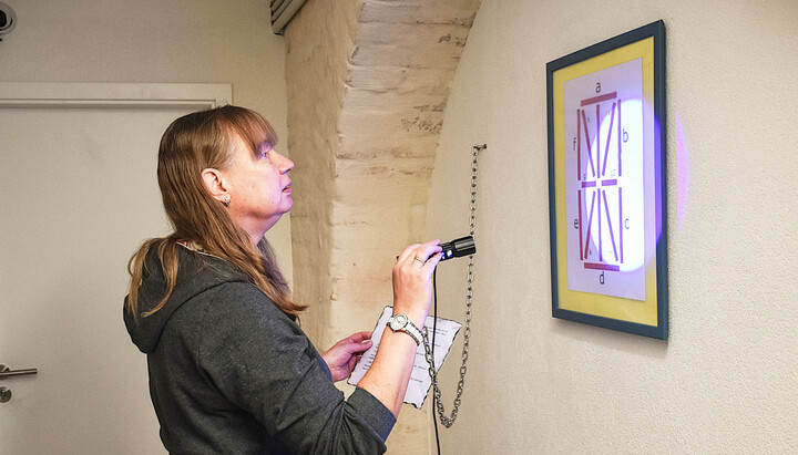 Жінка з ліхтариком перед головоломкою в квест-кімнаті Роггенбургського монастиря, 9 грудня 2025 р. Фото: KNA Жінка з ліхтариком перед головоломкою в квест-кімнаті Роггенбургського монастиря, 9 грудня 2025 р. Фото: KNA
