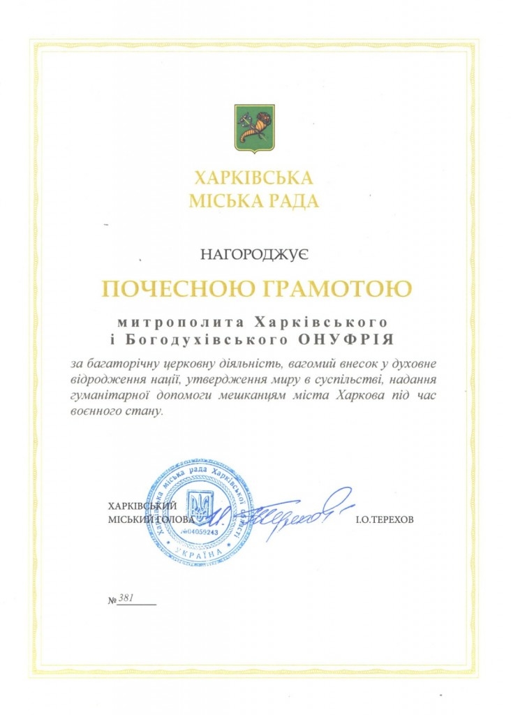 Керуючий Харківською єпархією Української Православної Церкви митрополита Харківського і Богодухівського Онуфрія нагороджено Почесною грамотою Харківської міської ради, повідомляє пресслужба єпархії.
