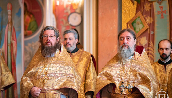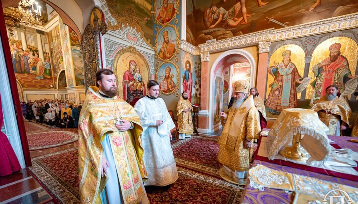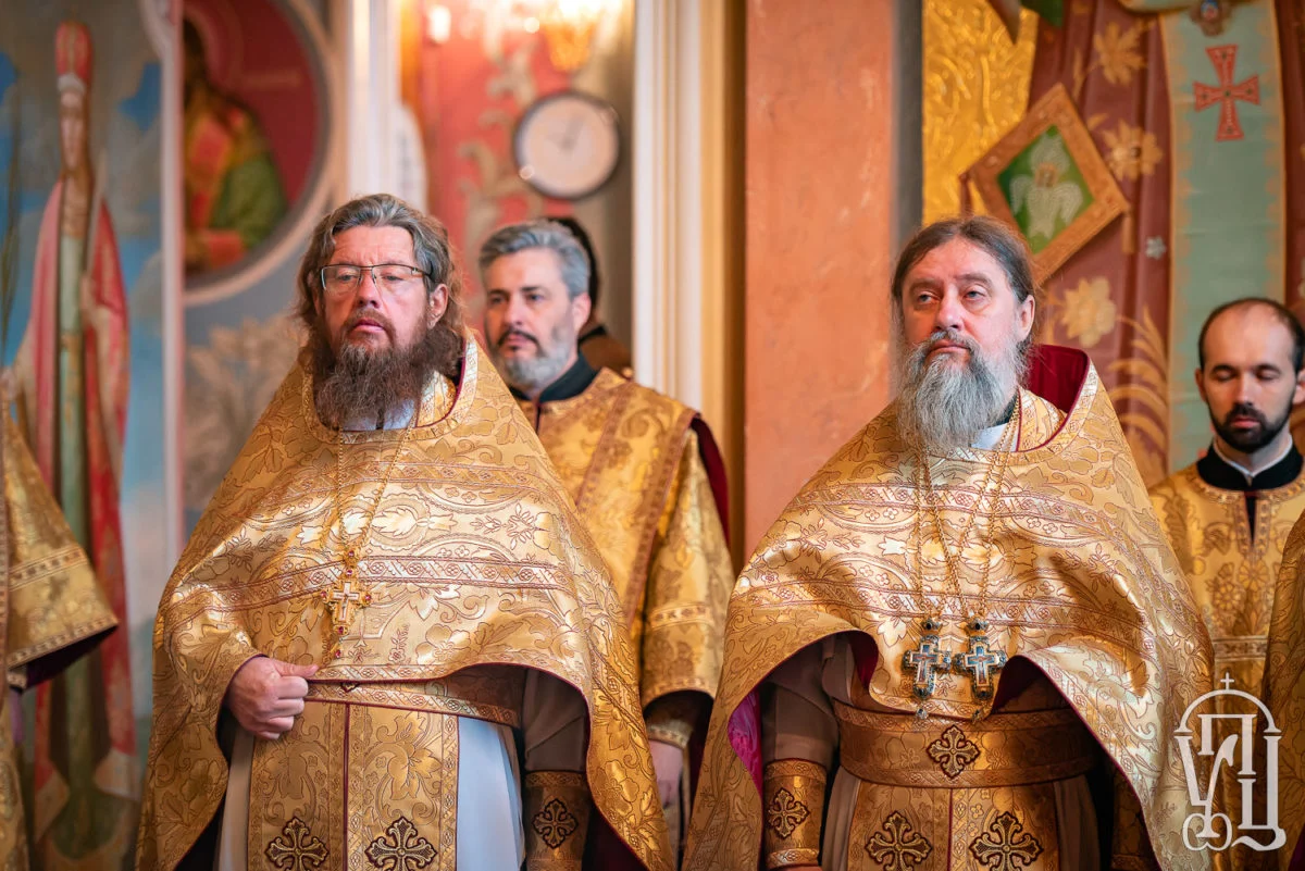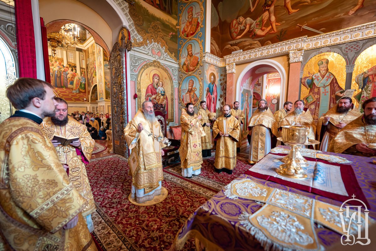 Предстоятелю УПЦ співслужили вікарії Київської єпархії єпископ Ірпінський Лавр та єпископ Бородянський Марк, духовенство обителі та гості у священному сані.