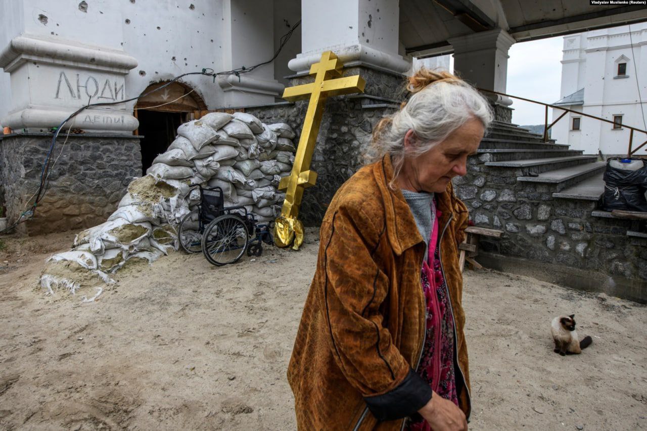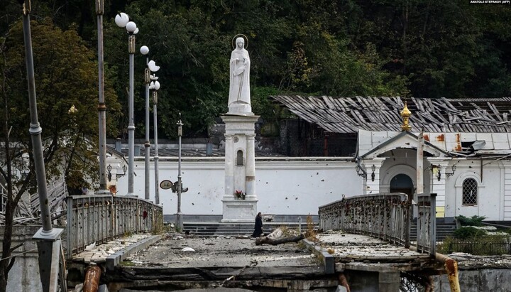 На фото видно, що масштабних руйнувань зазнала вся територія обителі, пошкоджені практично всі будівлі, збиті куполи, знищені дерева.