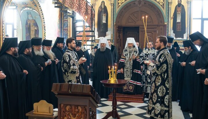 Богослужіння відбулося в храмі на ім'я преподобного Агапіта Печерського. Разом з Предстоятелем молилися архієреї, духовенство обителі та віруючі, співав братський хор монастиря.