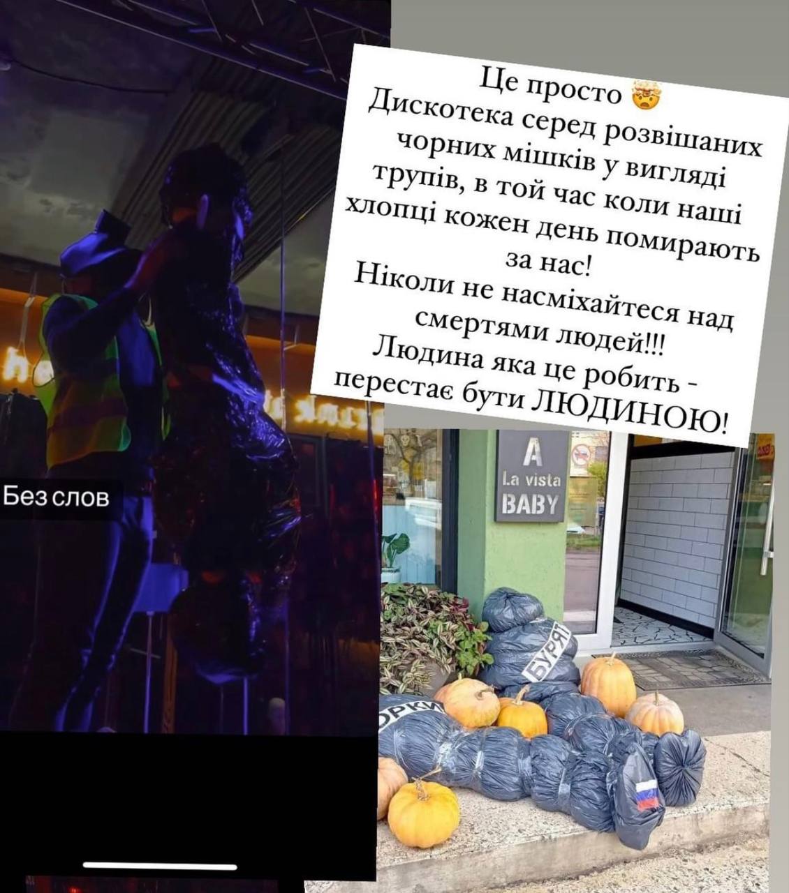 «Дискотека серед розвішаних чорних мішків у вигляді трупів, коли наші хлопці щодня помирають за нас!», – заявив солдат ЗСУ. Він наголосив, що ті, хто сміються над смертю, перестають бути людьми.