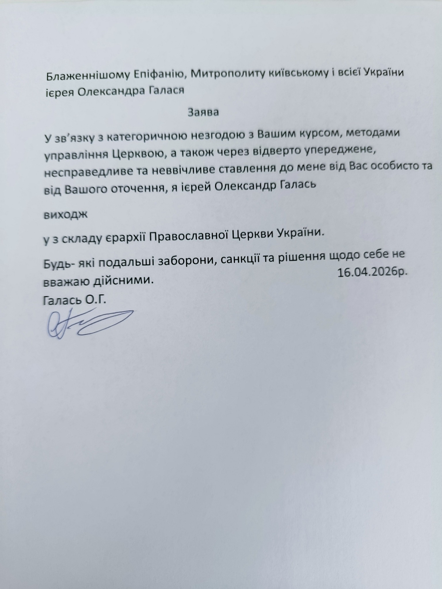 16 квітня 2026 року «ієрей» ПЦУ Олександр Галась направив заяву на ім'я глави ПЦУ Епіфанія Думенка про свій вихід зі складу «ієрархії» організації. Своє рішення священнослужитель пояснив категоричною незгодою з курсом Думенка, методами управління структурою та «відверто упередженим, несправедливим і неввічливим ставленням» з боку керівництва.