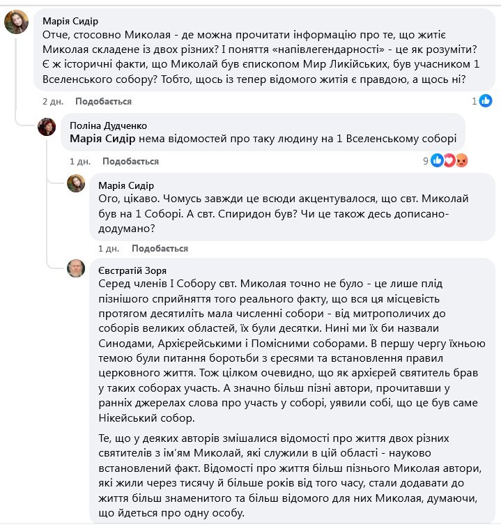 Спікер ПЦУ Євстратій Зоря заявив, що святитель Миколай Мірлікійський не був учасником Першого Вселенського Собору 325 року. Відповідний коментар він залишив під публікацією клірика ПЦУ Андрія Дудченка в Facebook.