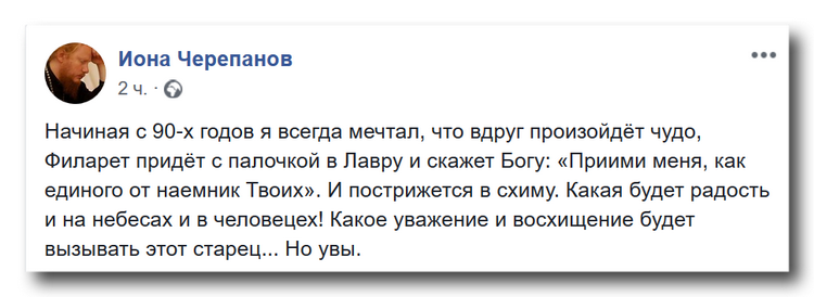 Филарет придёт с палочкой в Лавру и скажет Богу: «Прими меня, как единого от наемник Твоих». И пострижется в схиму. Какая будет радость и на небесах и в человецех! Какое уважение и восхищение будет вызывать этот старец... Но увы.
