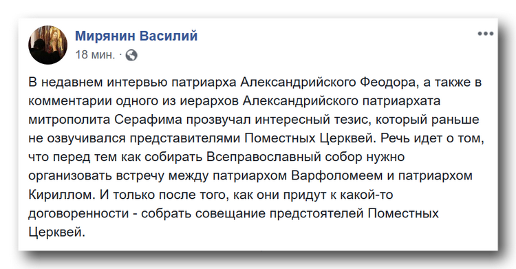 В недавнем интервью патриарха Александрийского Феодора, а также в комментарии одного из иерархов Александрийского патриархата митрополита Серафима прозвучал интересный тезис, который раньше не озвучивался представителями Поместных Церквей. Речь идет о том, что перед тем как собирать Всеправославный собор нужно организовать встречу между патриархом Варфоломеем и патриархом Кириллом. И только после того, как они придут к какой-то договоренности - собрать совещание предстоятелей Поместных Церквей.
