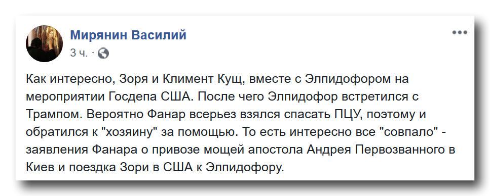 Как интересно, Зоря и Климент Кущ, вместе с Элпидофором на мероприятии Госдепа США. После чего Элпидофор встретился с Трампом. Вероятно, Фанар всерьез взялся спасать ПЦУ, поэтому и обратился к «хозяину» за помощью. То есть интересно все «совпало» - заявления Фанара о привозе мощей апостола Андрея Первозванного в Киев и поездка Зори в США к Элпидофору.