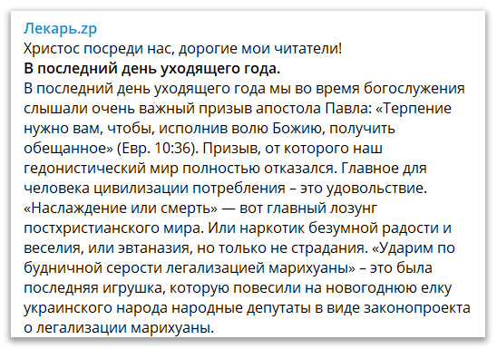 В последний день уходящего года мы во время богослужения слышали очень важный призыв апостола Павла: «Терпение нужно вам, чтобы, исполнив волю Божию, получить обещанное» (Евр. 10:36). Призыв, от которого наш гедонистический мир полностью отказался. Главное для человека цивилизации потребления – это удовольствие. «Наслаждение или смерть» — вот главный лозунг постхристианского мира. Или наркотик безумной радости и веселия, или эвтаназия, но только не страдания. «Ударим по будничной серости легализацией марихуаны» – это была последняя игрушка, которую повесили на новогоднюю елку украинского народа народные депутаты в виде законопроекта о легализации марихуаны.