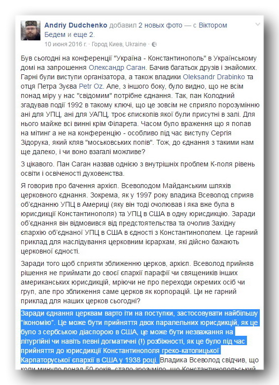 10 червня 2016 року в Києві проходила конференція «Українське Православ'я у світовій сім'ї Православних Церков: минуле, сьогодення і майбутнє», де обговорювалися теми об'єднання Церков. Примітними є одразу кілька речей. По-перше, окрім православних, на конференції були присутні уніати. По-друге, склад представників був вельми схожий з подібним заходом, який проходив у травні 2014 року в Канаді і також включав до складу уніатів. Тільки від УПЦ на зустріч прибув митрополит Олександр (Драбинко) разом з Андрієм Дудченком.