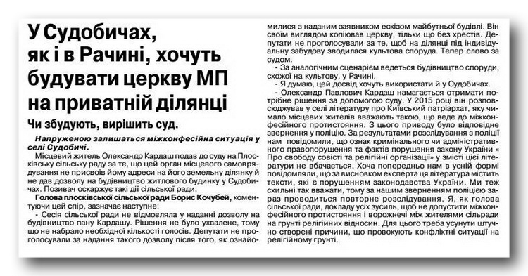 Міжцерковний конфлікт, який точиться у Судобичах другий рік, з кожним днем тільки загострюється. Нещодавно до кількох прихожанок УПЦ приходив представник поліції та під тиском намагався добитися зізнання з приводу того, що ієрей Олександр Кардаш поширює сепаратистську літературу. Ті, звичайно, відповіли відмовою. Поліція з цього питання також викликала на допит і самого батюшку, проте складу злочину, про який у письмовій формі повідомили органам правопорядку прихильники Київського патріархату, виявлено не було. Утім, за кілька днів у місцевій газеті все ті ж активісти таки розмістили статтю з вигадками і своєрідними домислами про «сепаратистську діяльність» батюшки.