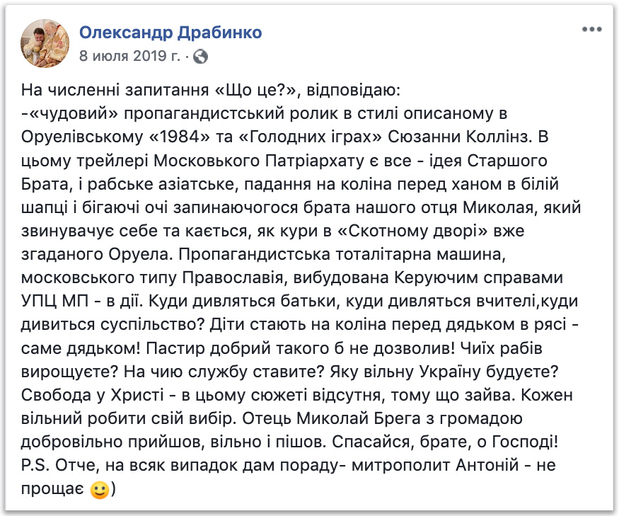 Особливо цікаво, що Олександр (Драбинко), який у часи Януковича називав себе творцем ідеології «руського міра» і навіть вчився в Москві, тепер заявляє, що храм Української Православної Церкви в Морозівці окупований Московським Патріархатом. Причому робить такі заяви регулярно. Драбинко згадав про «окупацію» відразу в трьох постах на своїй сторінці Фейсбук.