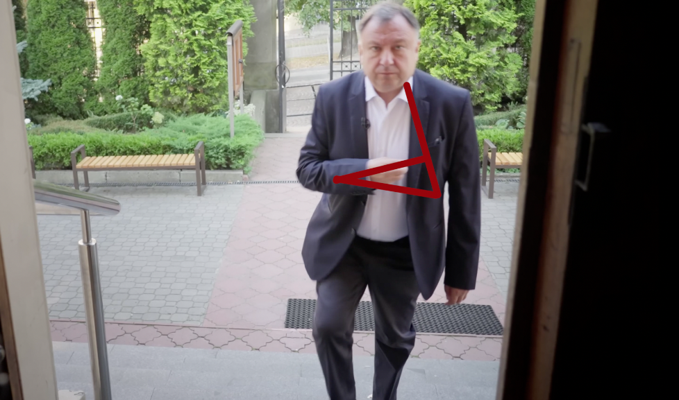 Замість хресного знамення він малює на своєму животі якийсь трикутник. Причому на католицький манер, зліва – направо. М. Княжицький – один із найактивніших пропагандистів Томоса ПЦУ та ненависників УПЦ. У 2022 р. він подав на розгляд Верховної Ради найодіозніший законопроєкт про заборону УПЦ, де прописав, що православними в Україні можуть називати себе лише ті, хто входить до структури Сергія Думенка. Можна подумати, що трикутник – це випадково так вийшло, боліла рука чи ще щось. Але інші кадри лише підтверджують, що нардеп, який вважає себе фахівцем у релігійних питаннях, зображує на собі саме такий знак. Ось стоп-кадр із храму на Прикарпатті.